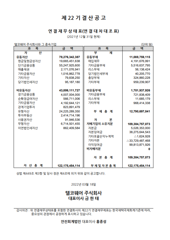 제 22기 결산공고_연결 재무상태표 페이지 정보 텔코웨어 2023-11-06 10:04 본문 목록 이전글제 23기 결산공고_별도 재무상태표 23.11.06 다음글제 22기 결산공고_별도 재무상태표 23.11.06